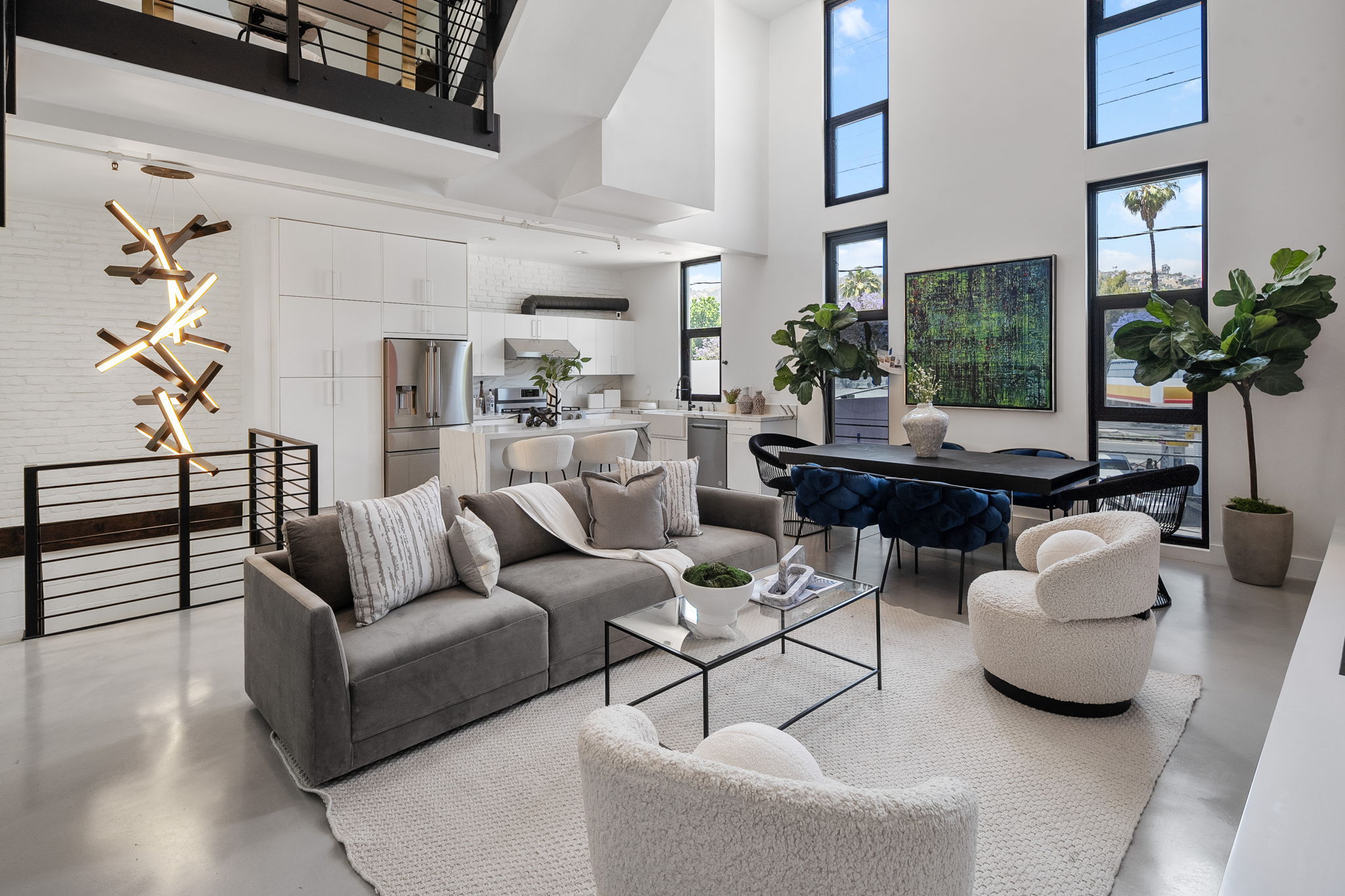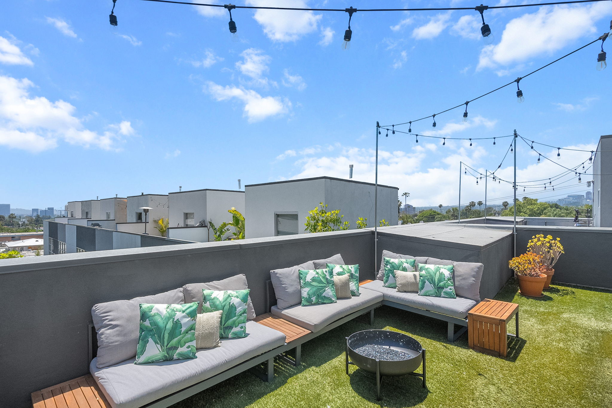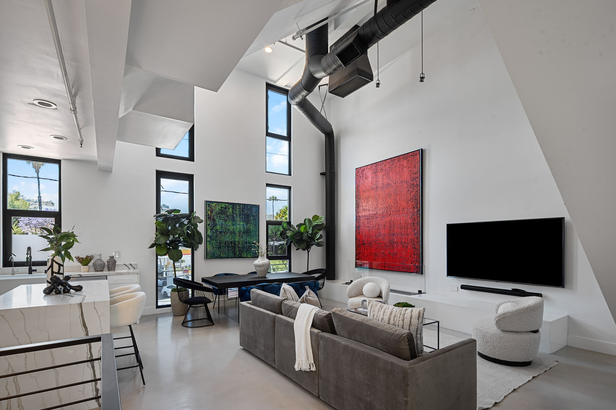 Live above it all in this impeccably designed penthouse condo that lives like a townhouse, nestled in the heart of West Hollywood. Offering 2,104 square feet of thoughtfully curated living space, this three-bedroom, three-bath residence features soaring ceilings, a striking blend of micro cement and wood floors, and elevated finishes throughout. One of the bedrooms on the first level has been converted into a custom walk-in closet but can easily be transformed back, offering flexible use of space to suit your lifestyle. The bright white kitchen is outfitted with newer appliances and opens into an airy living and dining area that flows effortlessly for entertaining or unwinding in style. Step outside to your private outdoor patio with a hot tub and outdoor shower, or ascend to the expansive rooftop deck to enjoy sweeping views from the Hollywood Hills to downtown Los Angeles. Additional highlights include rare guest parking, extra storage, and an unbeatable location near some of the city's most iconic restaurants, nightlife, and entertainment.