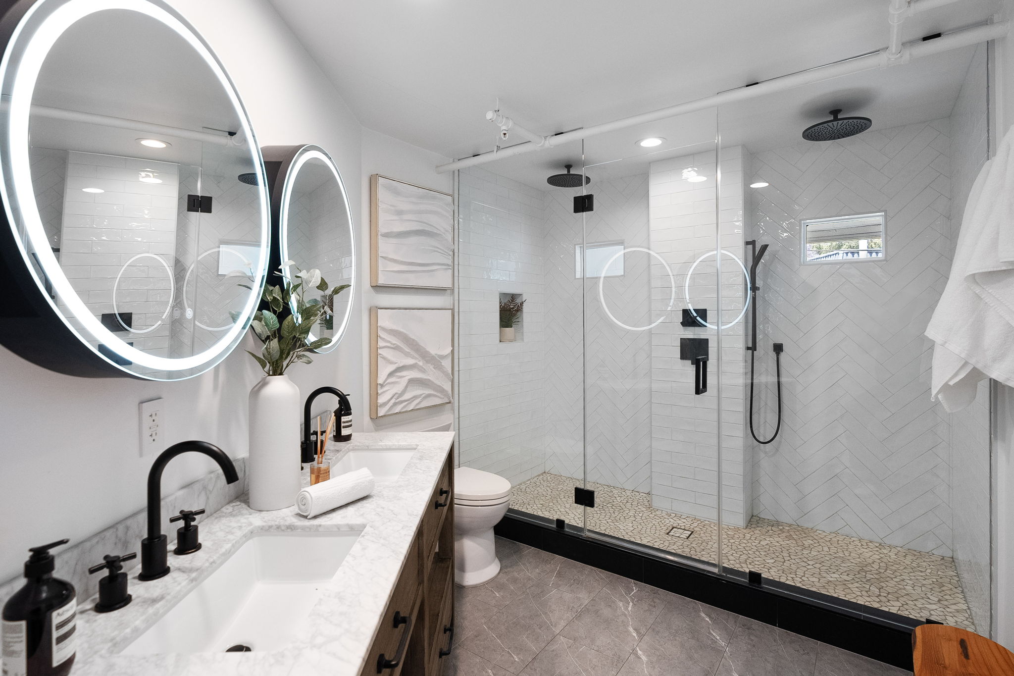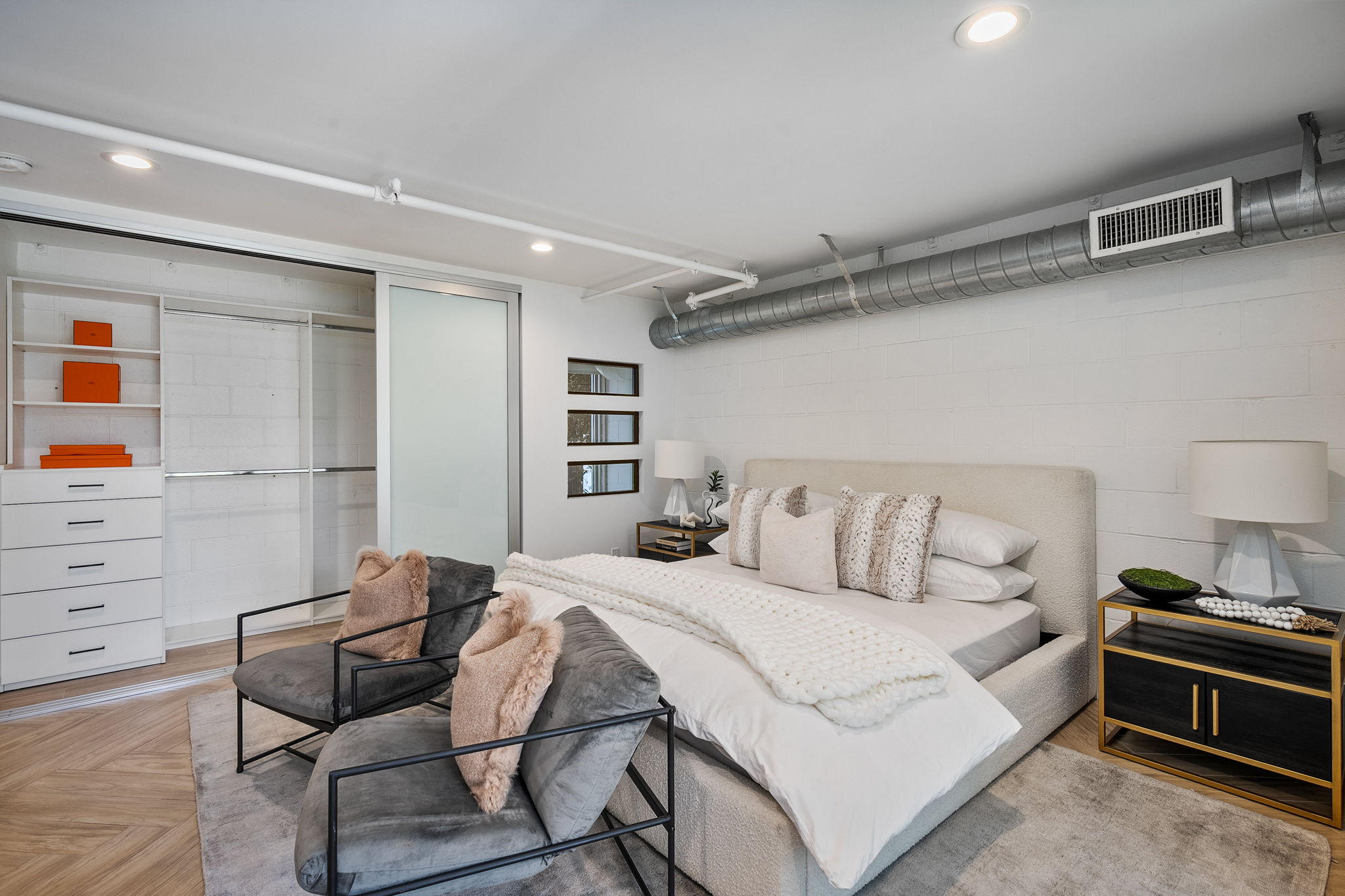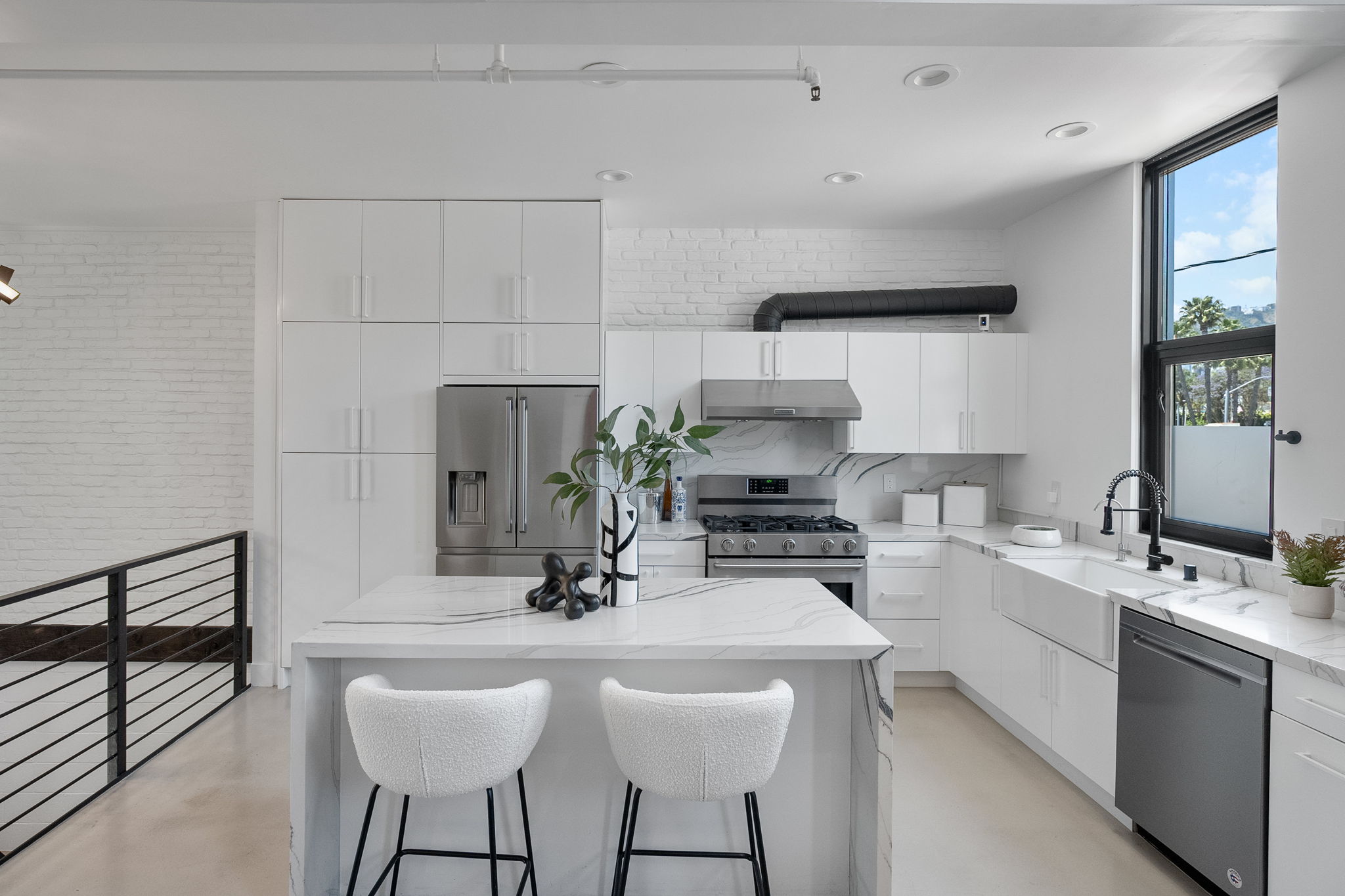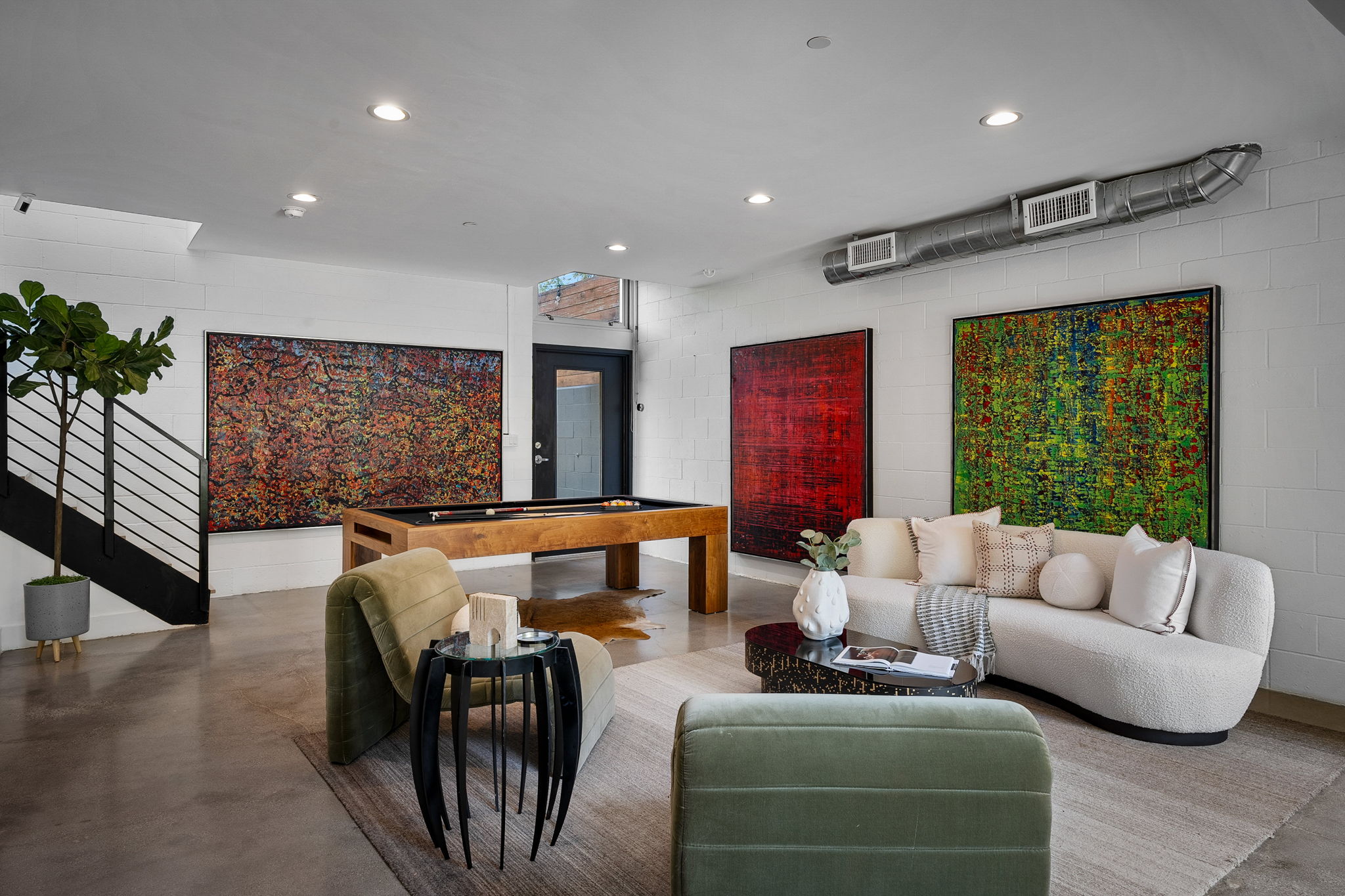 Live above it all in this impeccably designed penthouse condo that lives like a townhouse, nestled in the heart of West Hollywood. Offering 2,104 square feet of thoughtfully curated living space, this three-bedroom, three-bath residence features soaring ceilings, a striking blend of micro cement and wood floors, and elevated finishes throughout. One of the bedrooms on the first level has been converted into a custom walk-in closet but can easily be transformed back, offering flexible use of space to suit your lifestyle. The bright white kitchen is outfitted with newer appliances and opens into an airy living and dining area that flows effortlessly for entertaining or unwinding in style. Step outside to your private outdoor patio with a hot tub and outdoor shower, or ascend to the expansive rooftop deck to enjoy sweeping views from the Hollywood Hills to downtown Los Angeles. Additional highlights include rare guest parking, extra storage, and an unbeatable location near some of the city's most iconic restaurants, nightlife, and entertainment.
