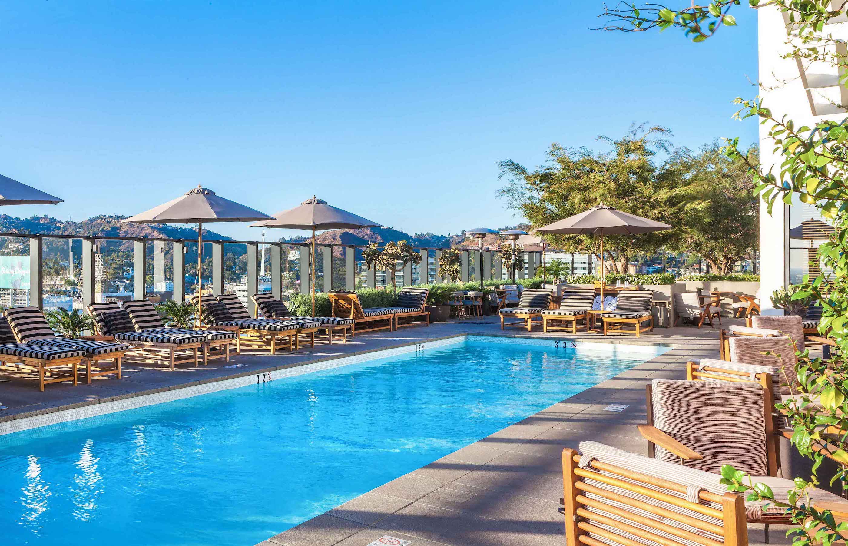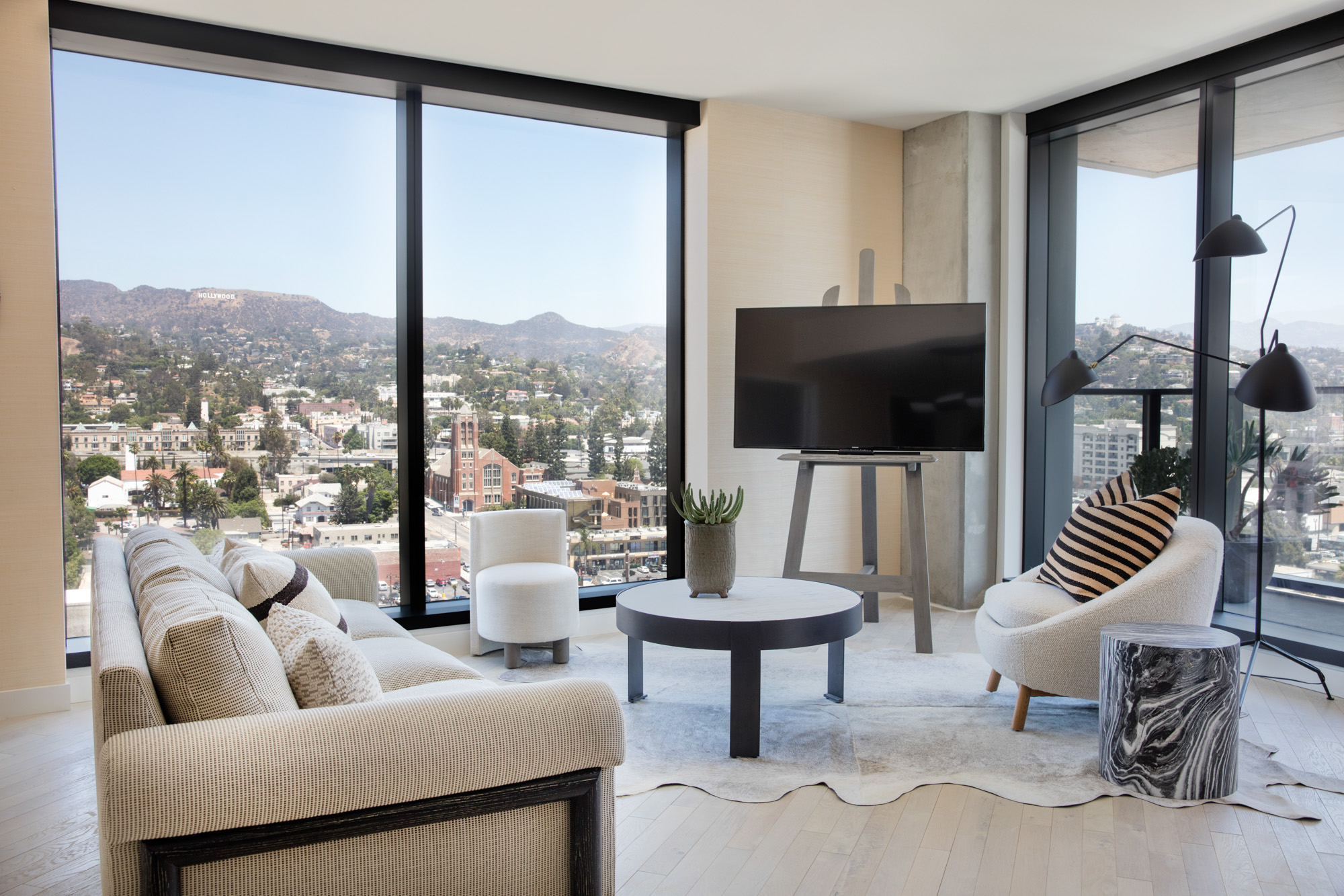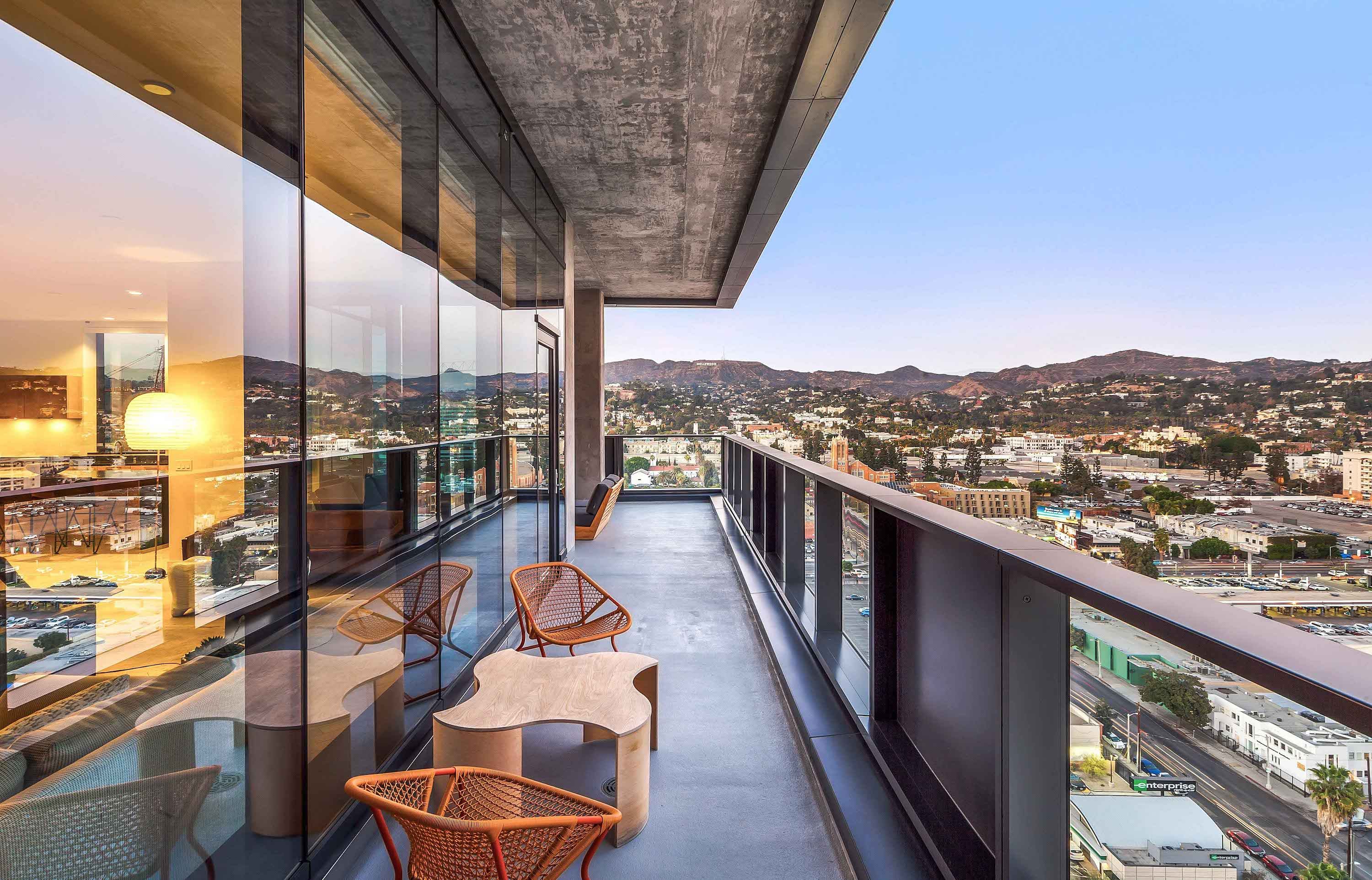 Hollywood Proper is a modern luxury residence located in the center of Hollywood at Columbia Square. The residences feature energy efficient soundproof floor to ceiling windows, custom oak cabinets with leather finishes, limestone kitchen and bathroom countertops and can be furnished upon request. The building features a stunning rooftop with 360 degree views, a swimming pool with private cabanas, indoor and outdoor dining and an elegant lounge that overlooks the Hollywood sign. There is a state of the art 1600 square foot gym as well as wellness classes on the Yoga terrace and resident certified personal trainers for hire. There is 24 hour/5-star white glove service. It is designed by the famous Kelly Wearstler, celebrity interior designer and brought to you by the founders of Viceroy hotels. All units come with a Proper Tablet which handles all service accommodations including room service, valet, concierge, etc.