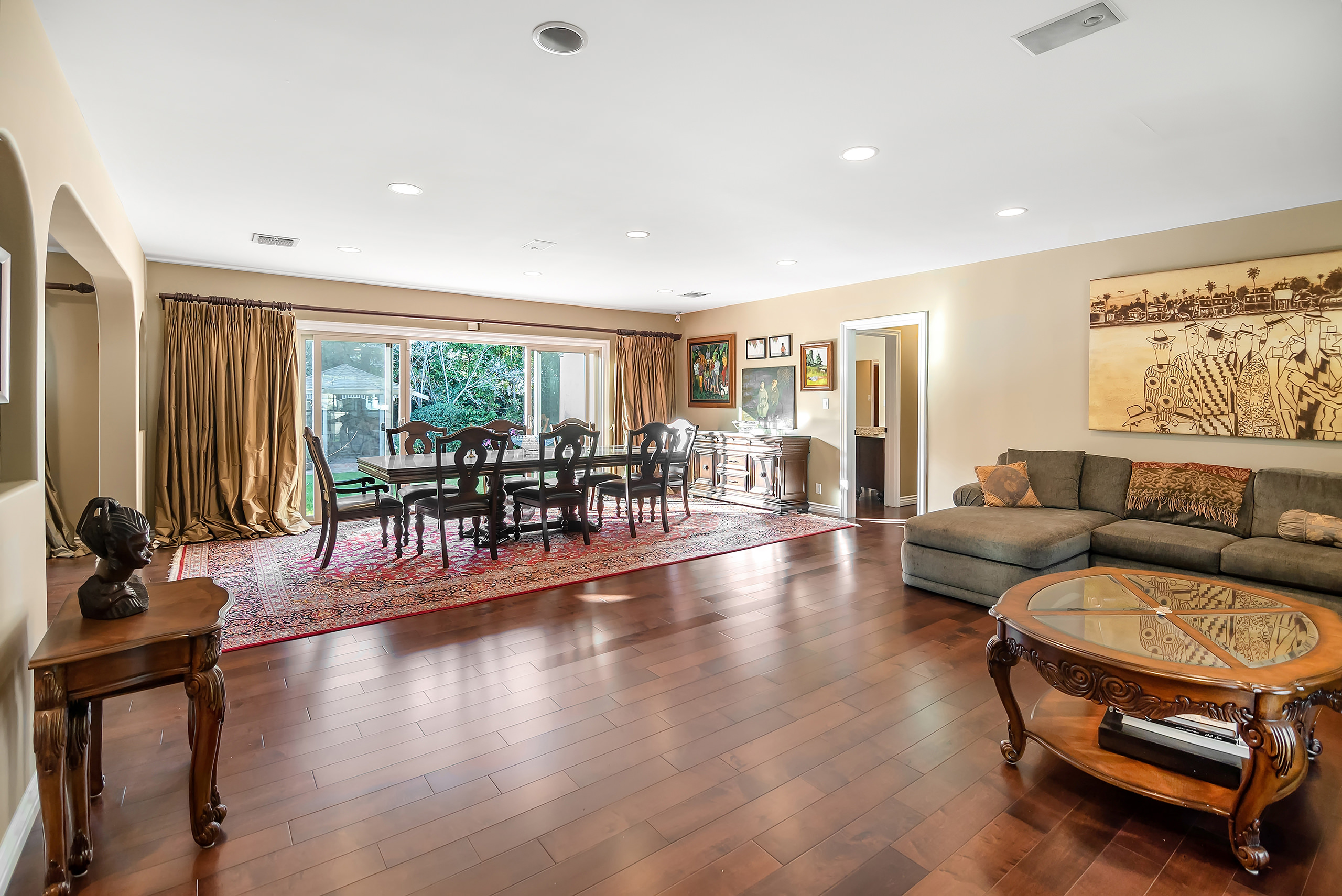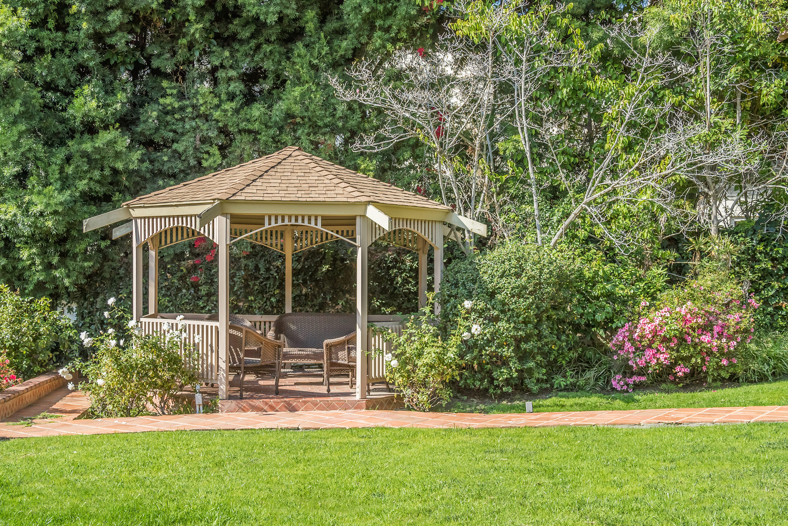 Only one showing to occur before reviewing offers, Tuesday, May 3rd, from 11-2pm. Nestled on an idyllic tree-lined street in the heart of Brentwood, this gated and private traditional sits on a large 13,637 sq. ft. lot. The single-story home features a large open living/dining space that leads to the spacious backyard with a sparkling pool, gazebo, and grassy yard perfect for entertaining. Additional sport court in the front yard. The gourmet chef’s kitchen has gorgeous granite countertops and top-of-the-line stainless steel appliances with a separate breakfast eating area. An oversized primary suite is replete with a separate sitting/TV area, fireplace, and spa-like ensuite bathroom with walk-in closet. Three additional bedroom suites. A beautifully appointed den with vaulted wood-beamed ceilings and brick fireplace can also be used as an office. Central A/C, skylights, hardwood floors, and a built-in sound system complete this amazing family home. Attached 2-car garage. A must-see property for those who value a single-story home situated on a large lot in a prestigious Westside location.