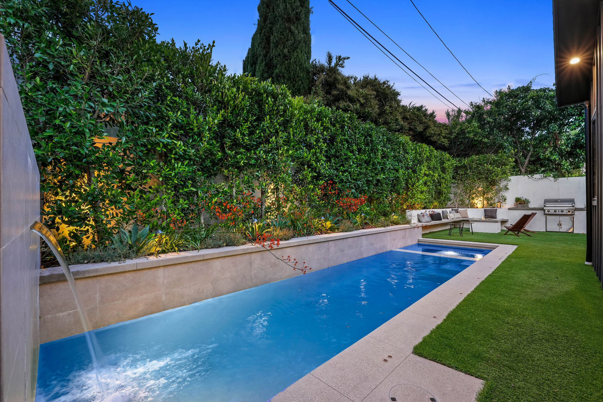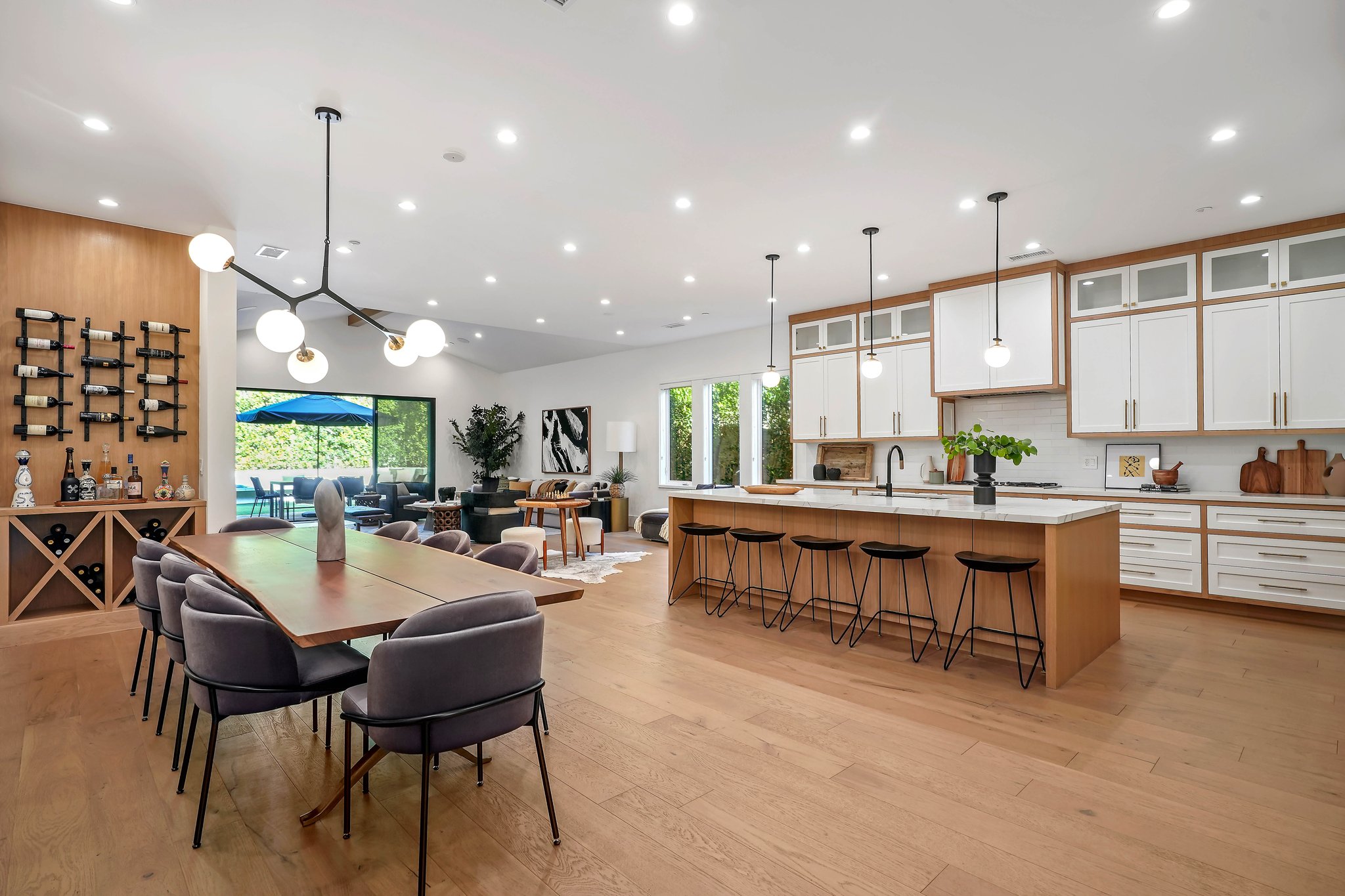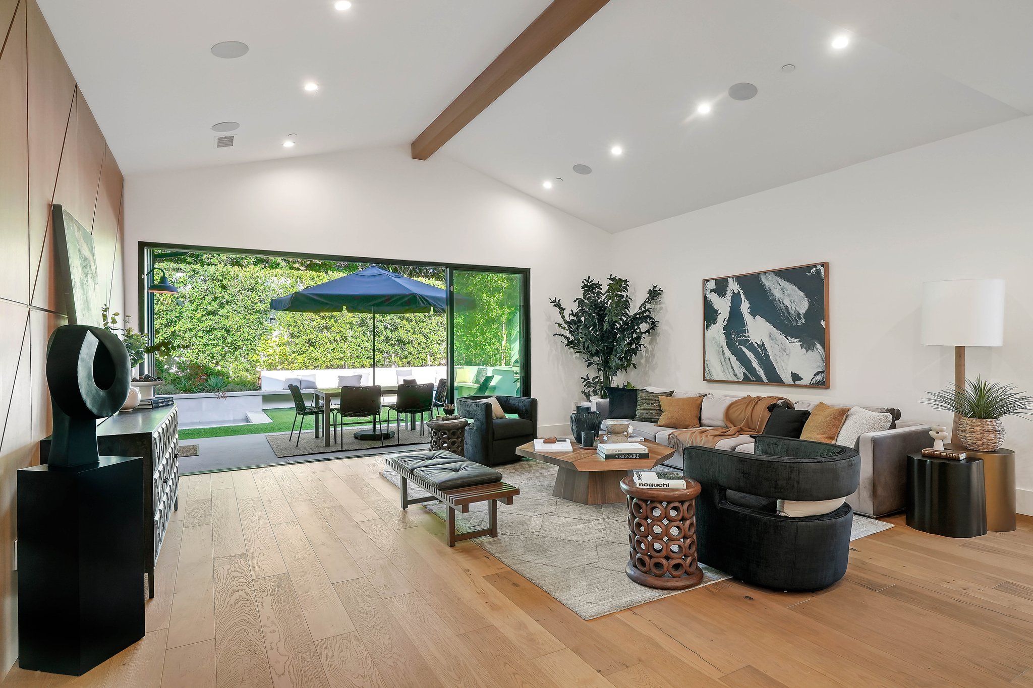 Located on a beautiful tree-lined street, this recently built single-story contemporary farmhouse with pool is privately gated and hedged with a grassy front yard. The home boasts 4 beds + an office / 5 baths including a luxurious primary suite with a large walk-in closet and spa-like bathroom with a free standing tub, huge separate shower, and double vanity sinks. Incredible curb appeal on the exterior, the property exudes warmth and sophistication throughout with impeccable finishes including light oak wood flooring, exposed wood beams, and wooden accent walls in the living area and all bedrooms. An open floor plan and vaulted ceilings highlight the voluminous scale of the house, with the living area opening to the grassy backyard via sliding glass doors replete with a pool/spa, BBQ, and built-in seating around an exterior fireplace. A gorgeous chef’s kitchen features an oversized center island with built-in breakfast seating, white quartz countertops, and custom cabinetry. Perfect for both family and guests, each bedroom is equipped with its own private ensuite bathroom. 2-car garage with additional gated driveway parking. Owner upgrades include smart-home systems including Sonos and lighting, Control 4 gate control, new landscaping, and driveway gate.