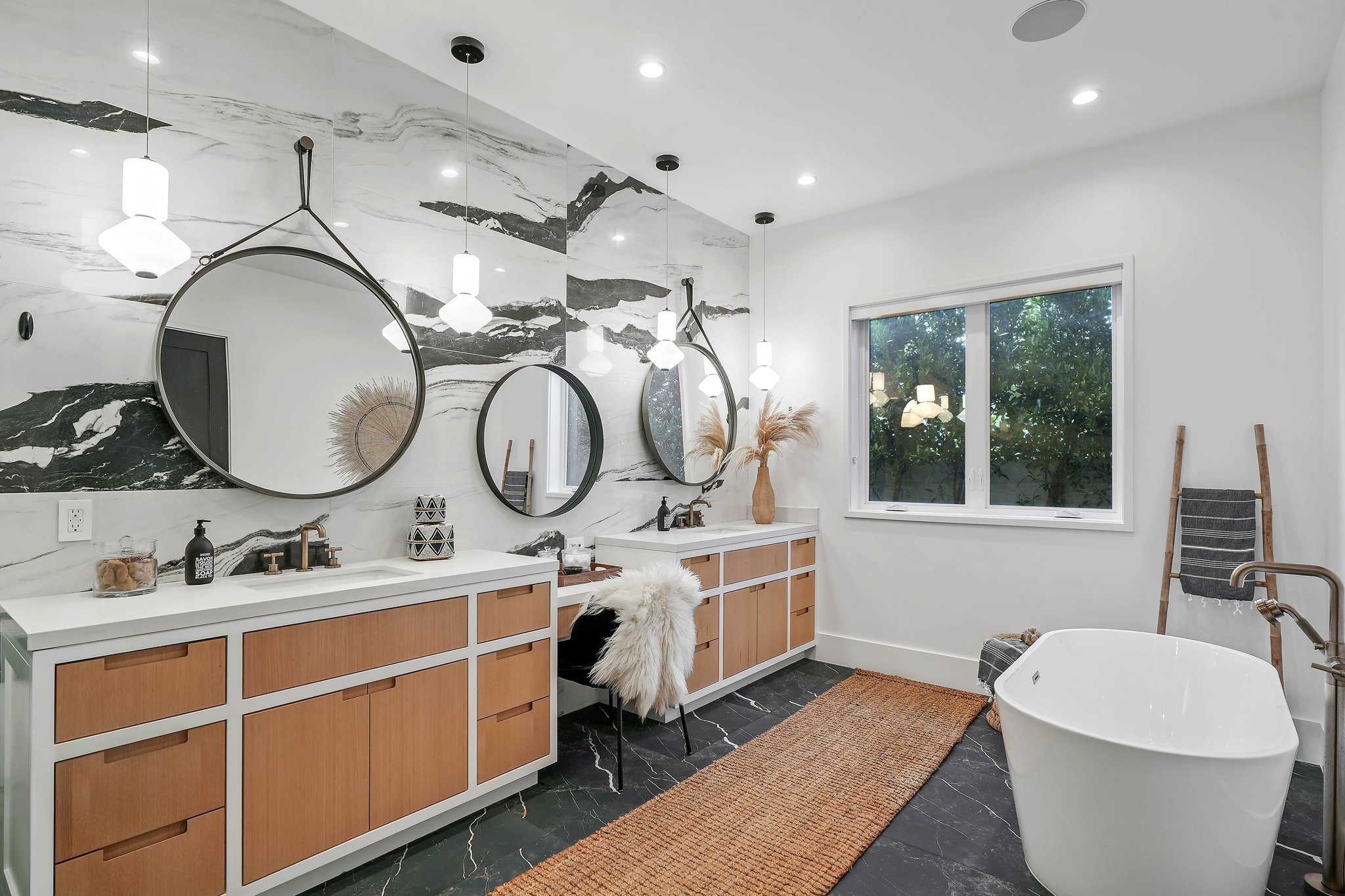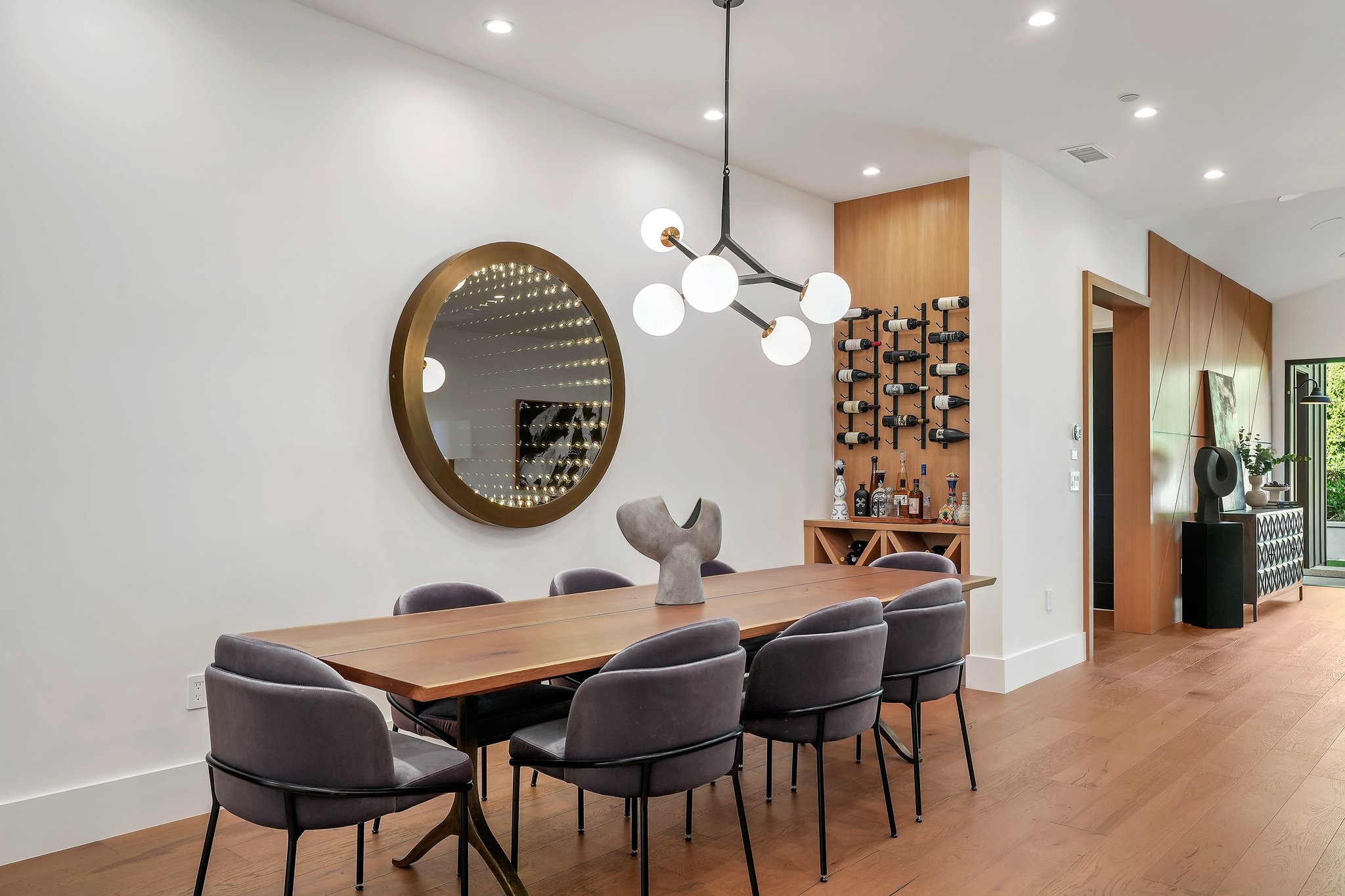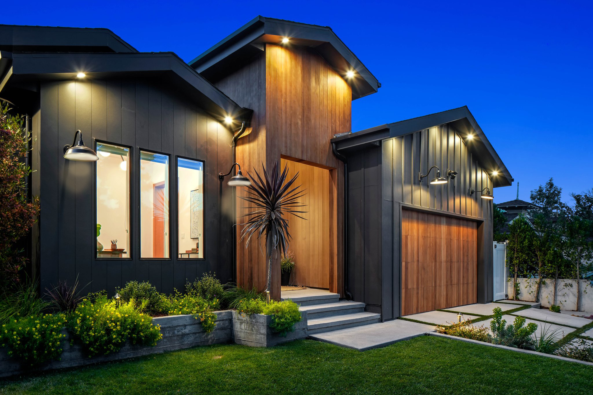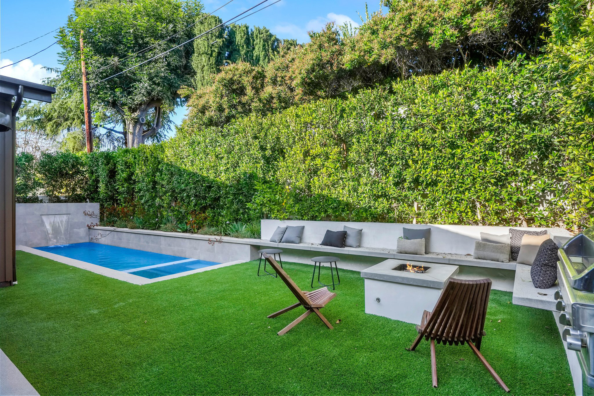 Located on a beautiful tree-lined street, this recently built single-story contemporary farmhouse with pool is privately gated and hedged with a grassy front yard. The home boasts 4 beds + an office / 5 baths including a luxurious primary suite with a large walk-in closet and spa-like bathroom with a free standing tub, huge separate shower, and double vanity sinks. Incredible curb appeal on the exterior, the property exudes warmth and sophistication throughout with impeccable finishes including light oak wood flooring, exposed wood beams, and wooden accent walls in the living area and all bedrooms. An open floor plan and vaulted ceilings highlight the voluminous scale of the house, with the living area opening to the grassy backyard via sliding glass doors replete with a pool/spa, BBQ, and built-in seating around an exterior fireplace. A gorgeous chef’s kitchen features an oversized center island with built-in breakfast seating, white quartz countertops, and custom cabinetry. Perfect for both family and guests, each bedroom is equipped with its own private ensuite bathroom. 2-car garage with additional gated driveway parking. Owner upgrades include smart-home systems including Sonos and lighting, Control 4 gate control, new landscaping, and driveway gate.