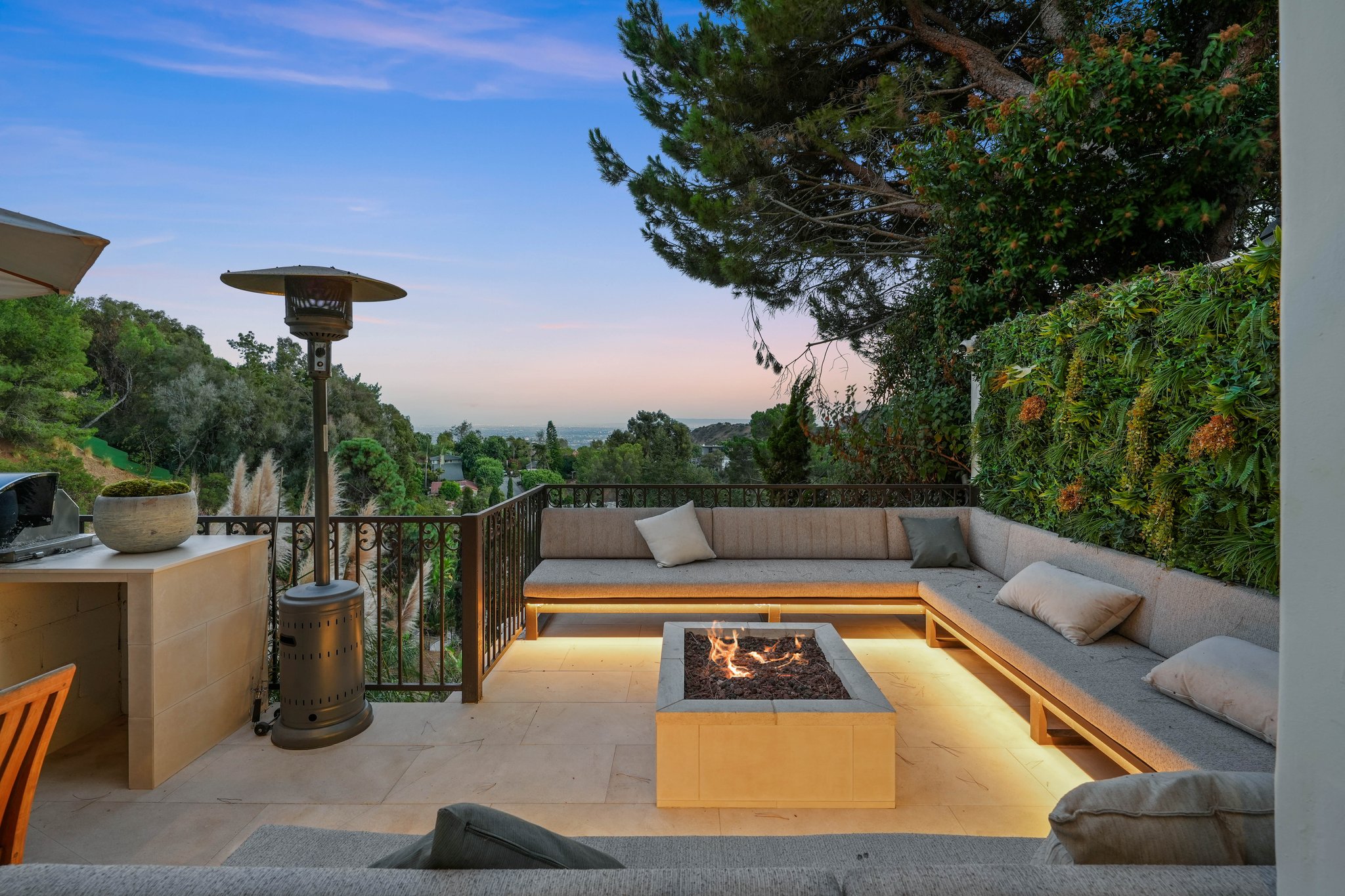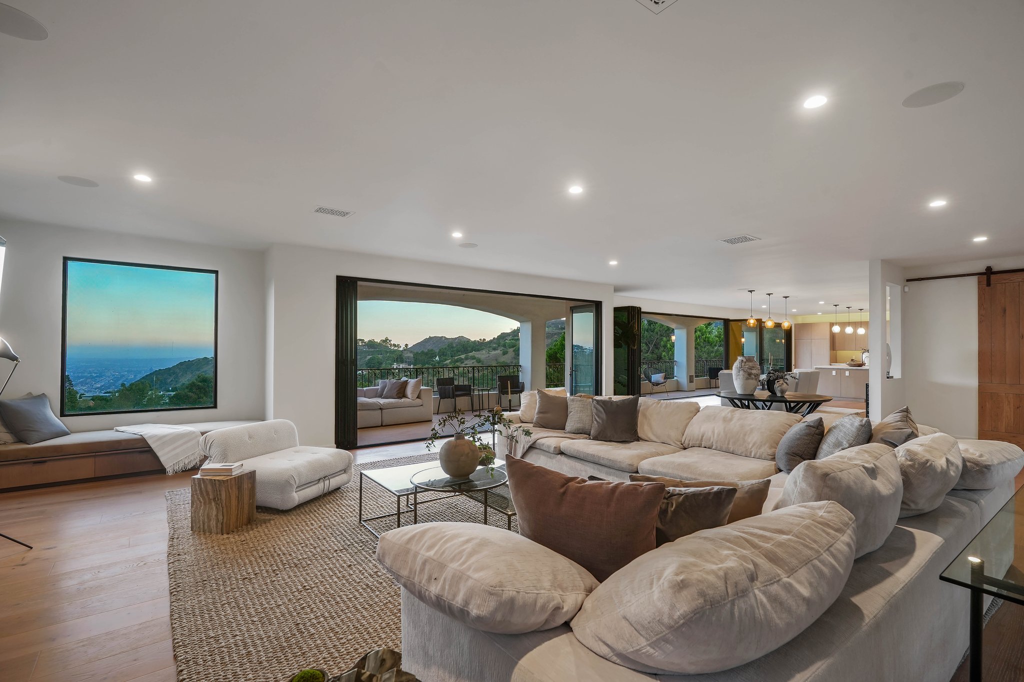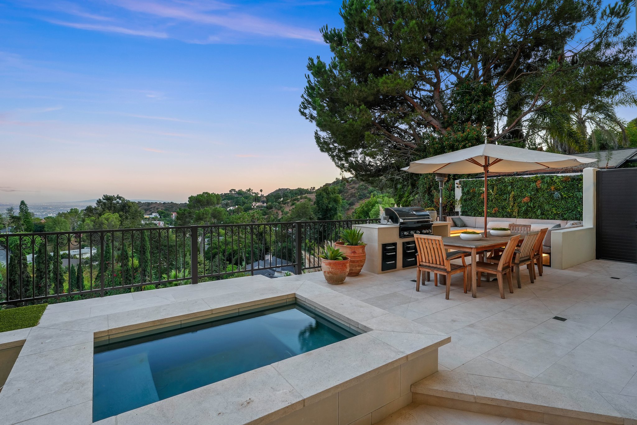 Perched in the Hollywood Hills behind private gates, discover unparalleled luxury in this beautifully renovated Contemporary Mediterranean estate offering breathtaking jetliner views of the Los Angeles skyline. This exceptional home combines elegance with a warm and organic flair, creating a serene and sophisticated retreat. Enter past the manicured lawn with gorgeous olive trees, to an expansive open floor plan where the living and dining areas effortlessly flow into a gourmet chef’s kitchen replete with bespoke neutral-toned cabinetry. A towering wall of sliding glass doors reveals the spectacular city and canyon views, leading to a sprawling balcony perfect for al fresco dining and relaxation. The nearly 2,000 sq. ft. primary suite includes a wet bar, balcony, cozy fireplace with private living area, and a luxurious ensuite bathroom that is complemented by a vast walk-in closet. Descend via the private elevator to a realm of opulent amenities, including a state-of-the-art home theater, an indoor/outdoor entertainment level, and a wellness center complete with a massage area, sauna, and gym. The backyard is an entertainer’s dream, featuring an elegantly lit outdoor space with a bar, fire-pit, BBQ area, and a stunning pool and spa. The gated parking area can accommodate up to 4 vehicles, in addition to a substantial 3-car attached garage. Modern conveniences include advanced smart home automation and surveillance systems, ensuring both comfort and security. Conveniently located near Runyon Canyon and just a short drive from Hollywood and Studio City.