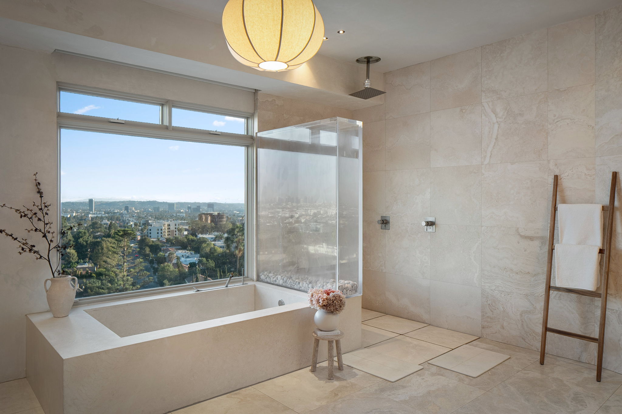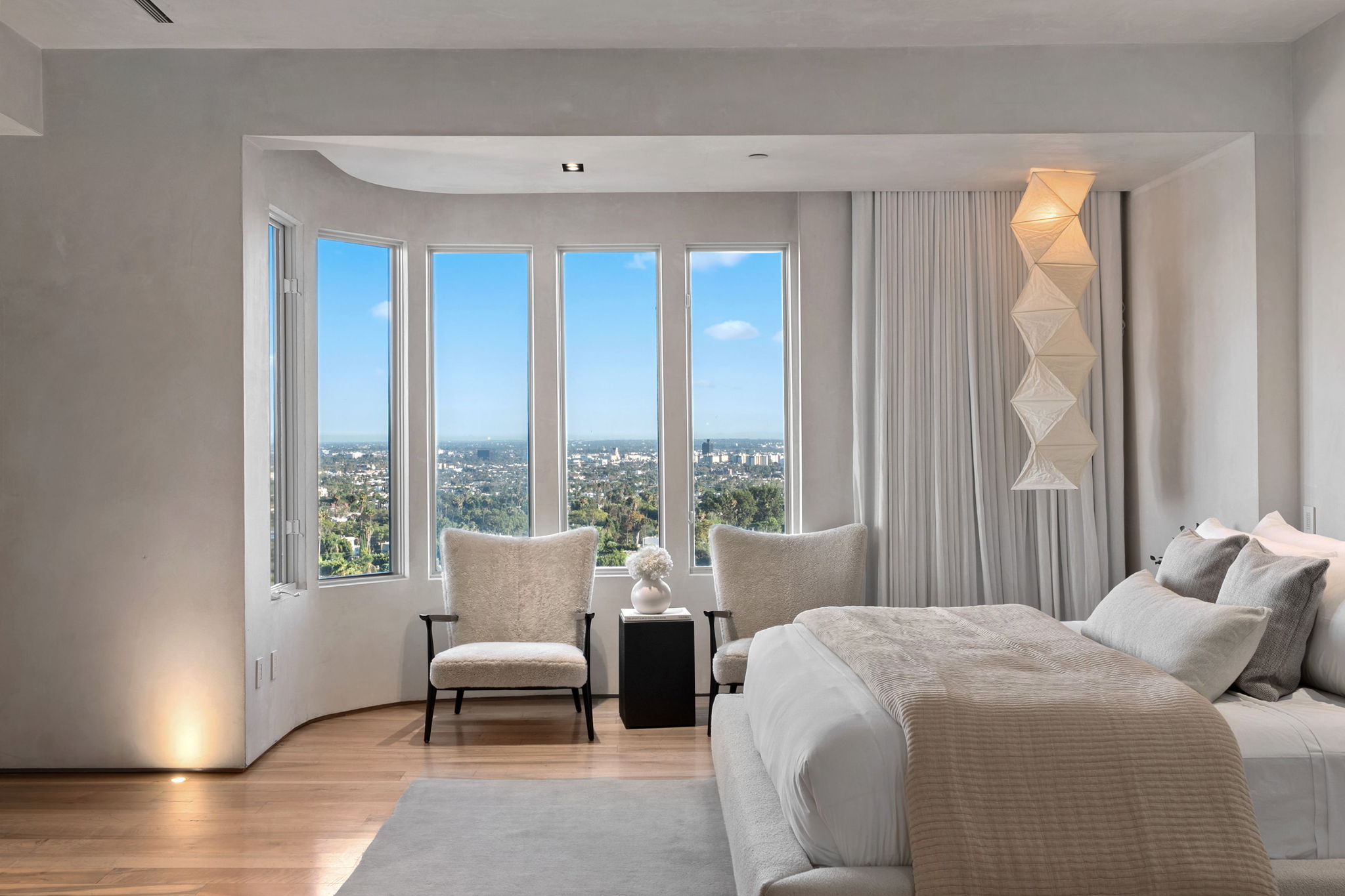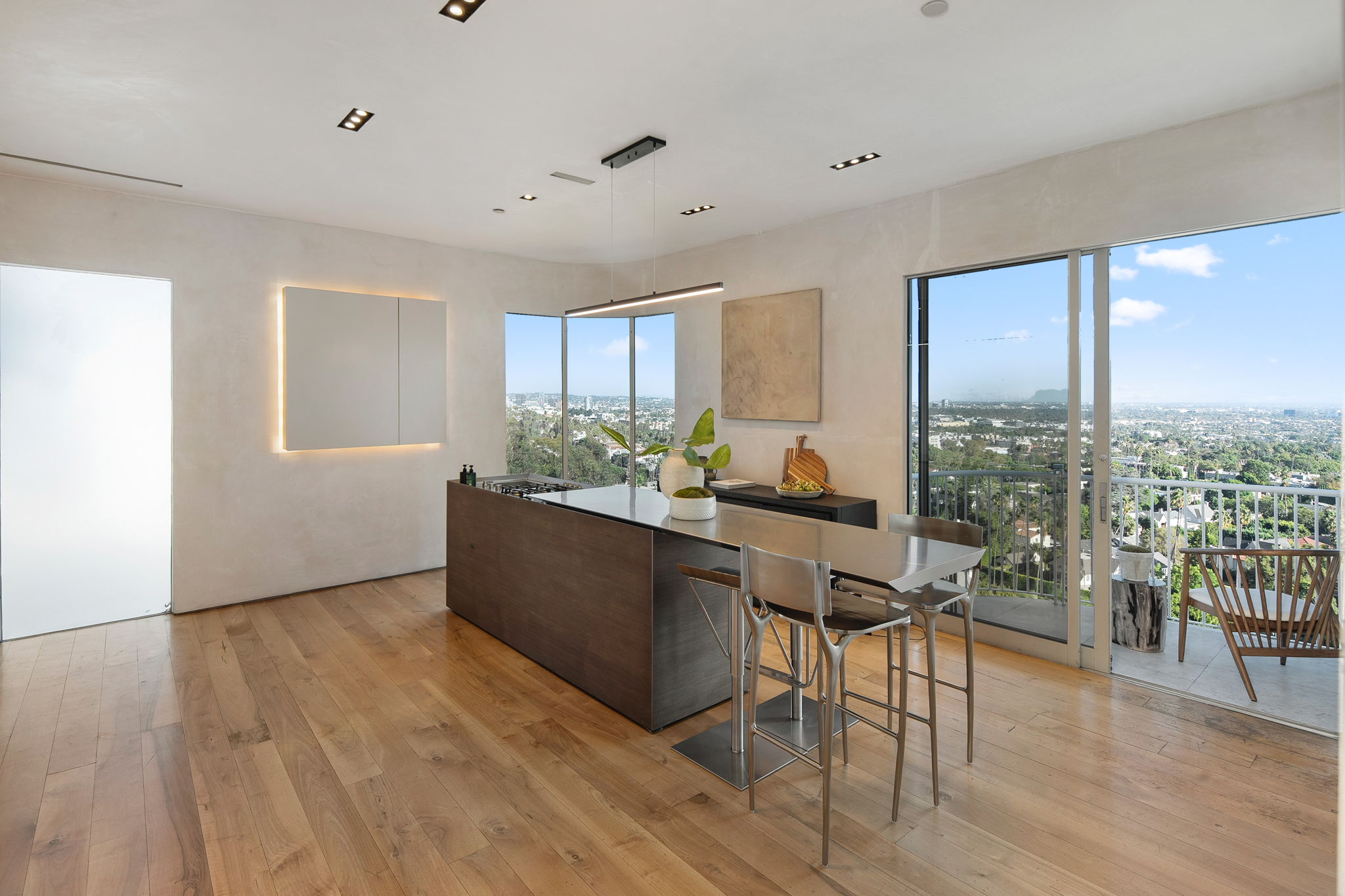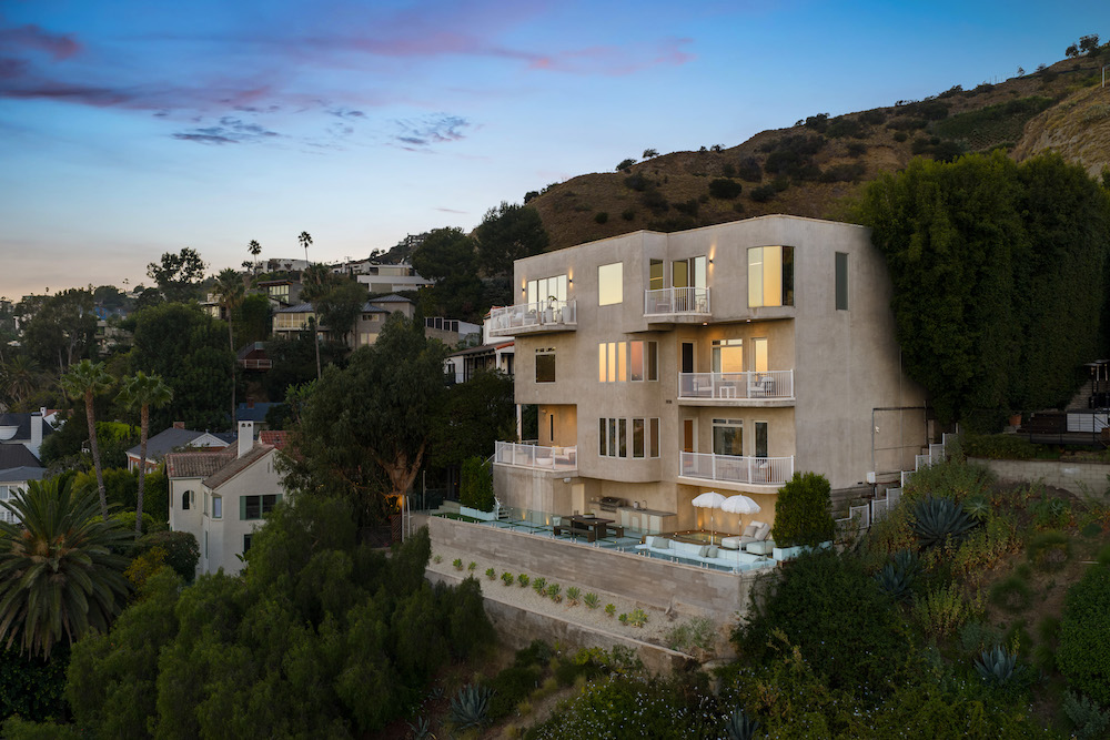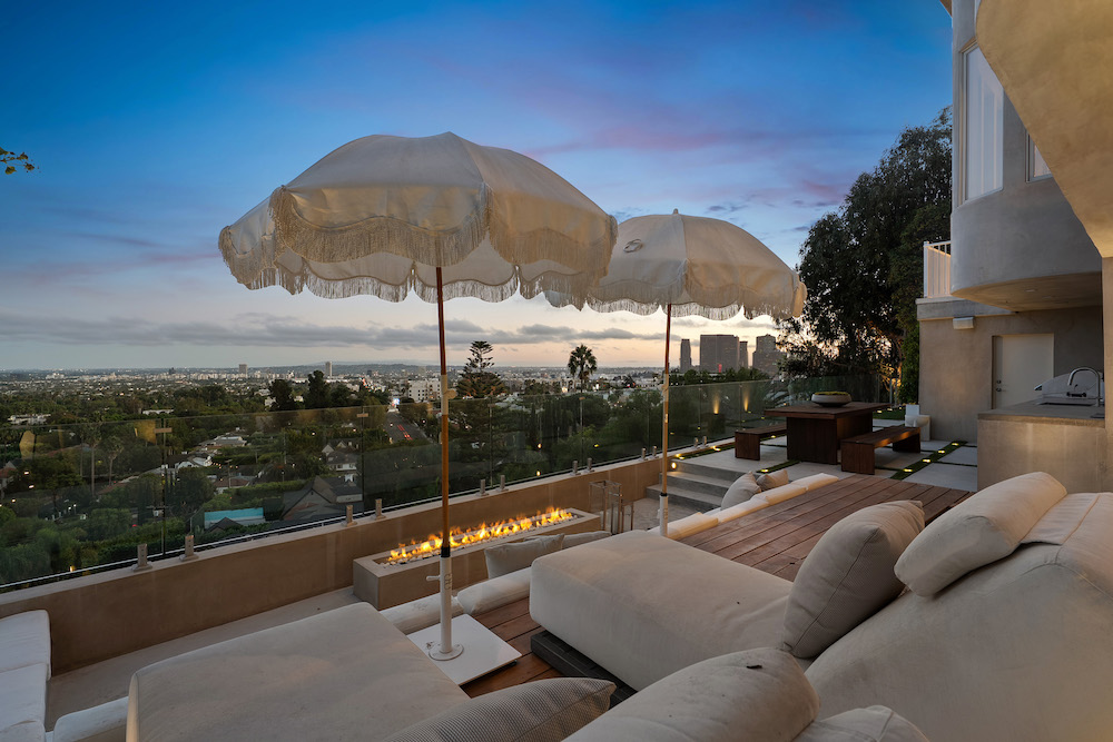 This privately-gated and former celebrity-owned contemporary hideaway sits above it all, with jetliner views stretching from Downtown LA to Century City and out to the ocean. Framed by a dramatic pivot door, the designer-done home opens to soaring ceilings, smooth Venetian plaster, hardwood floors, and sun-drenched interiors that exude a sophisticated and organic feel. The main level showcases a spacious formal living room that flows seamlessly into the dining area and chef's kitchen, designed for both effortless entertaining and everyday living. The relaxing primary suite offers a travertine-cladded spa-like bathroom with walk-in shower and separate soaking tub, a picture window framing endless panoramic vistas, and an oversized walk-in closet. Two additional guest bedrooms are replete with en-suite baths and private balconies, with an additional flexible space that can serve as a screening room, office, or fourth bedroom. Outdoors, this estate takes entertaining to the next level with a newly added outdoor kitchen/BBQ, in-ground spa, sauna, outdoor shower, and dramatic outdoor fireplace with built-in seating providing the perfect stage for al-fresco dining, sunset gatherings, or simply unwinding above the city lights. With a prestigious history, unmatched style, and coveted location just moments from the Sunset Strip and West Hollywood, this residence is truly a private retreat set against one of the most breathtaking backdrops in Los Angeles.