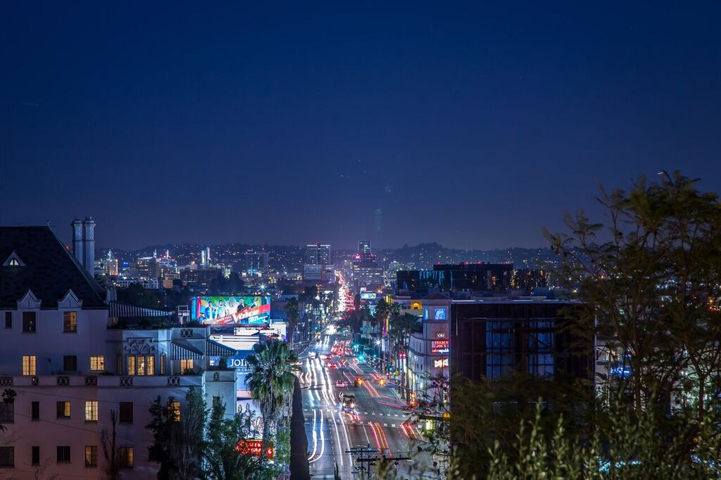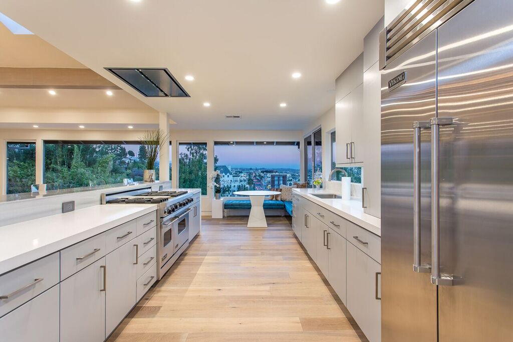 Perched on a cul-de-sac just above the Chateau Marmont, sits this completely renovated and gated estate with jetliner city views. A private entrance leads you to an expansive living room with soaring vaulted ceilings, sleek gourmet chef's kitchen with 15' center island, stainless professional-grade appliances, and ample natural light through the several skylights and wall-to-wall windows. The first level also features a modern office space with separate entrance. Three spacious downstairs bedrooms all have downtown views and direct access to a sprawling backyard with sparkling pool and BBQ area, including a master suite with an elegant spa-like bathroom subtly accented with Carrara marble. Ample parking with a 2-car garage, additional carport, and plenty of street parking. This thorough and tasteful renovation creates an ambiance of sophistication and warmth for the most discriminating buyer. See virtual tour.