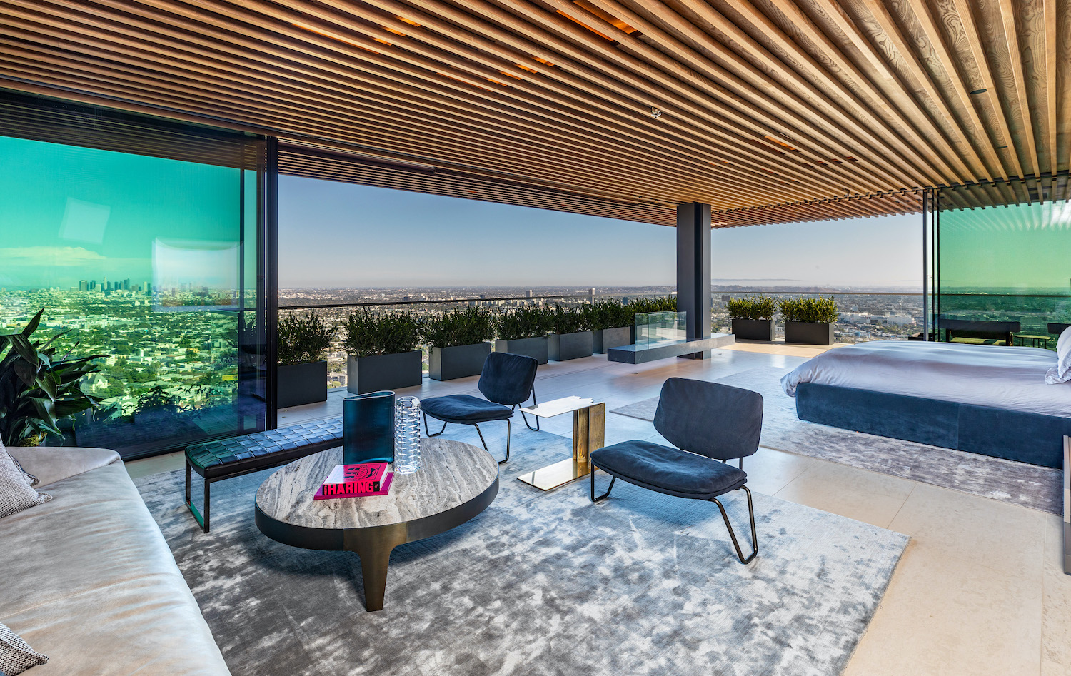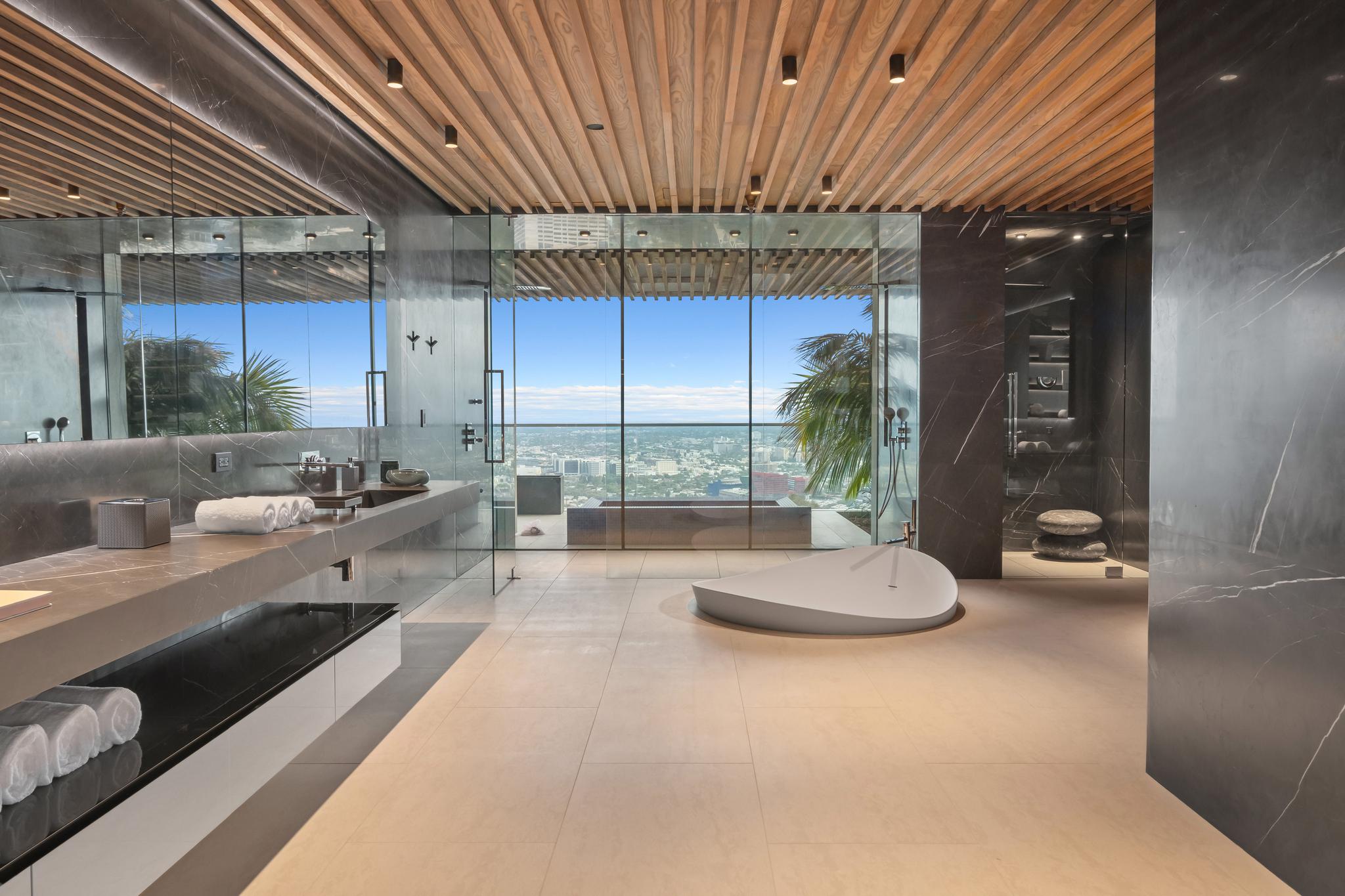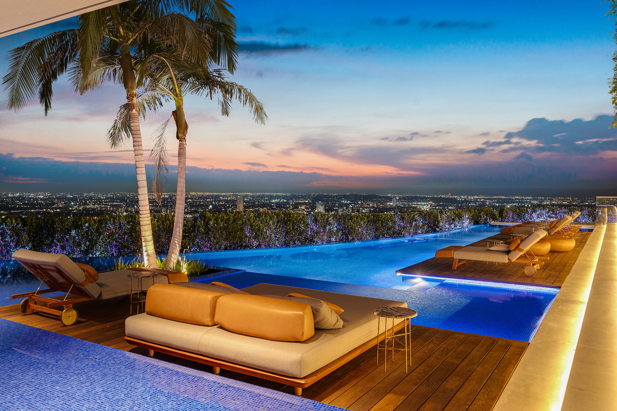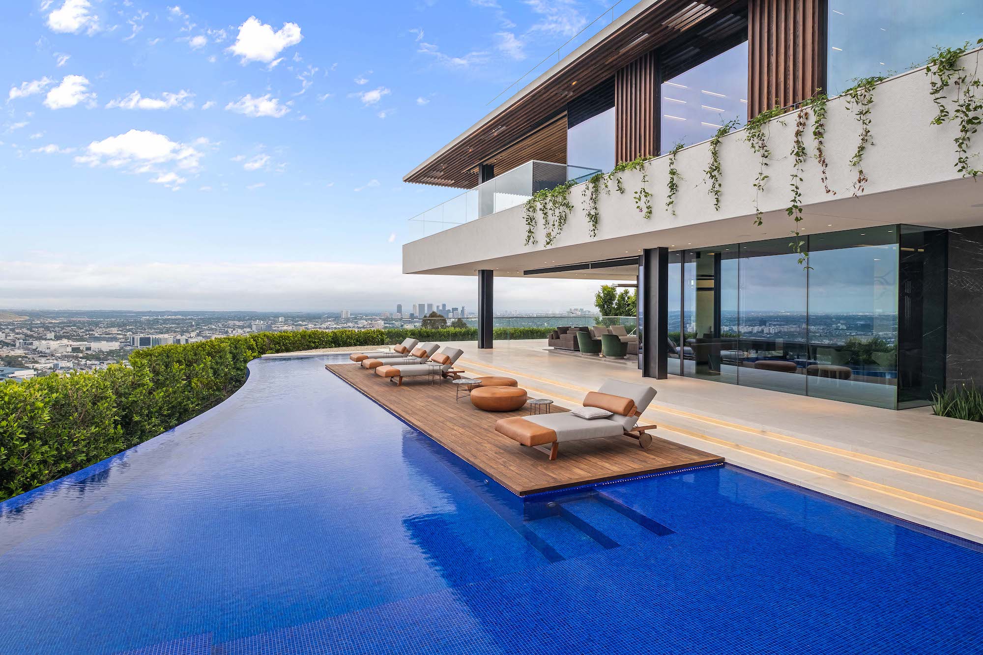 From world-renowned architectural design firm, Saota, this 20,000 sq. ft. estate is set on a promontory with unparalleled 300 degree city skyline views boasting unmatched design and exquisite bespoke finishes throughout. Automated glass sliding doors create a seamless confluence from the interior living spaces to plentiful outside seating and dining areas, including a 175-foot linear pool culminating in a waterfall cascading into an atrium garden. A 15-foot outdoor television rises from the ground with horizontal and vertical rotation, visible from every room in the house. Enormous entertainer's rooftop deck, state-of-the-art theater, curated wine cellar, glass elevator, unrivaled security and audio/visual integration, and a spa retreat replete with wet and dry sauna, cold and hot water plunge pools, and massage therapy. Private driveway leads to a multi-car garage. Unquestionably the most impressive property ever built above the Sunset Strip.