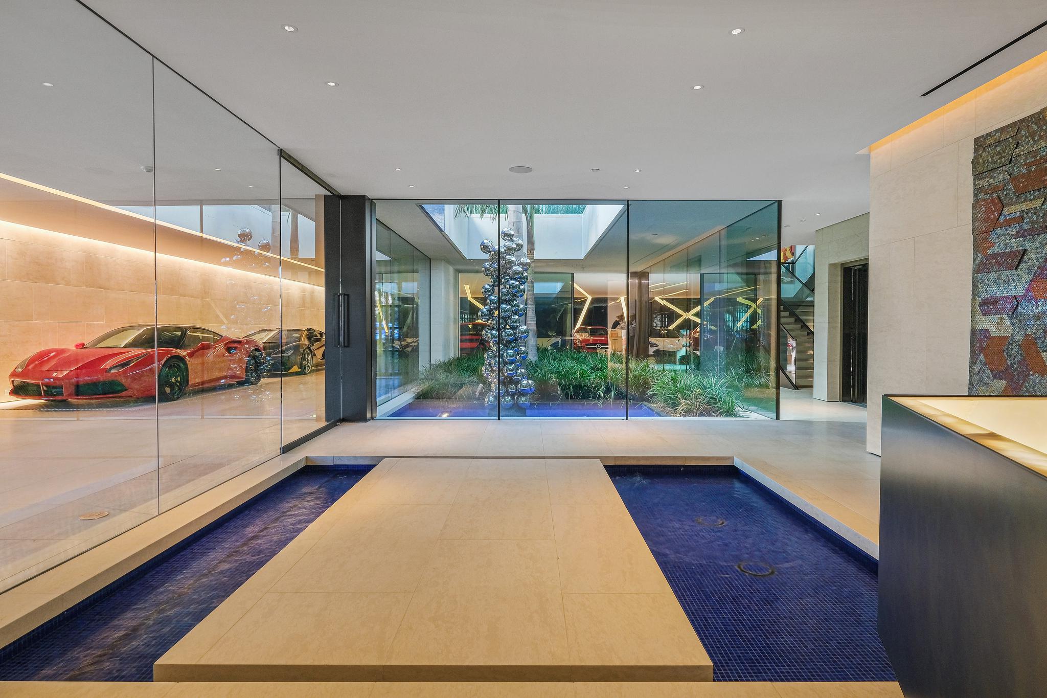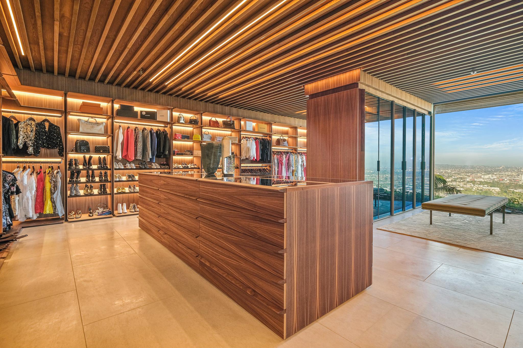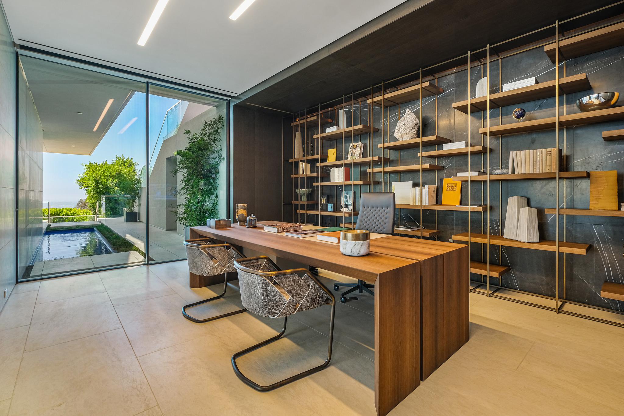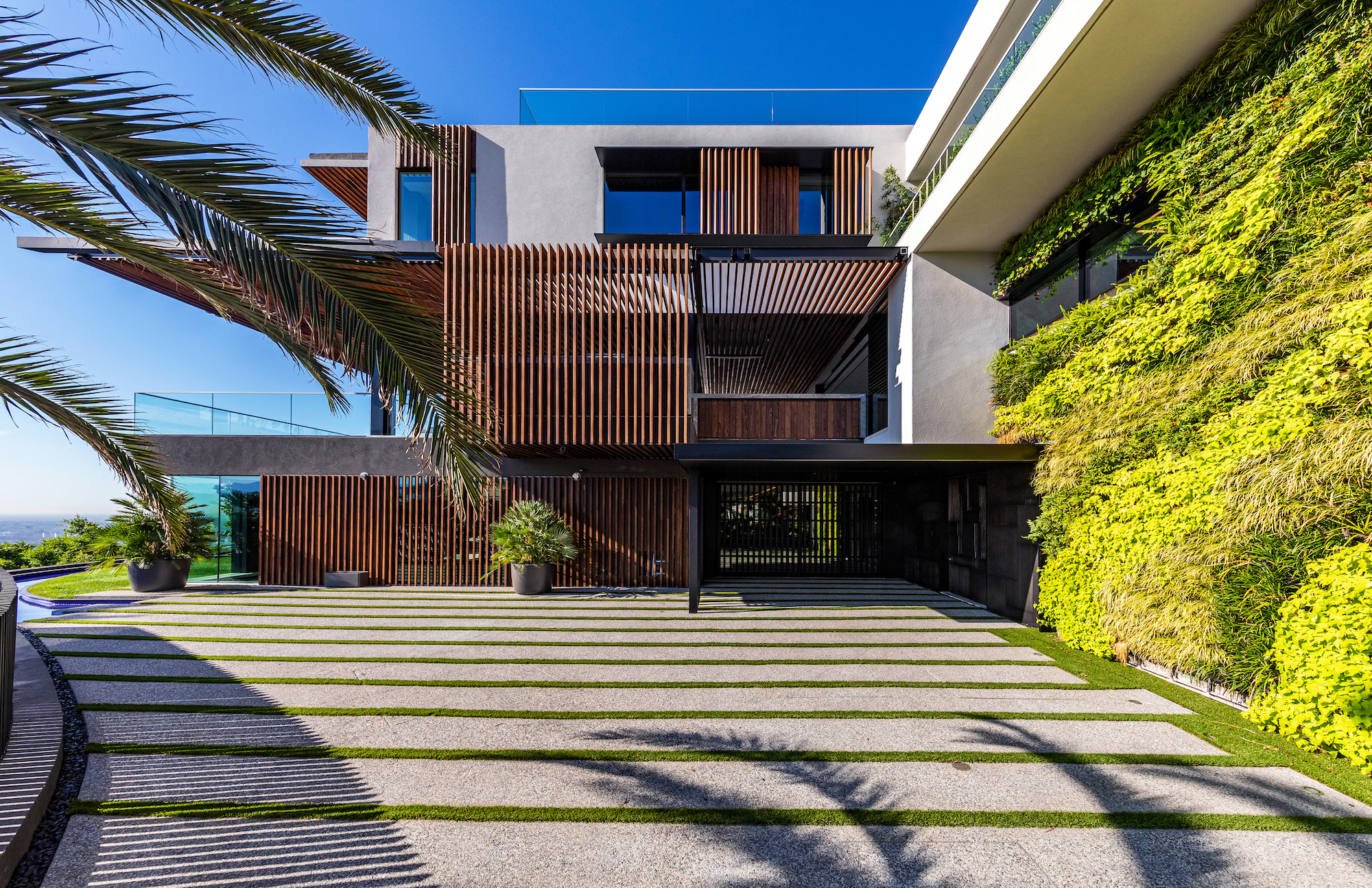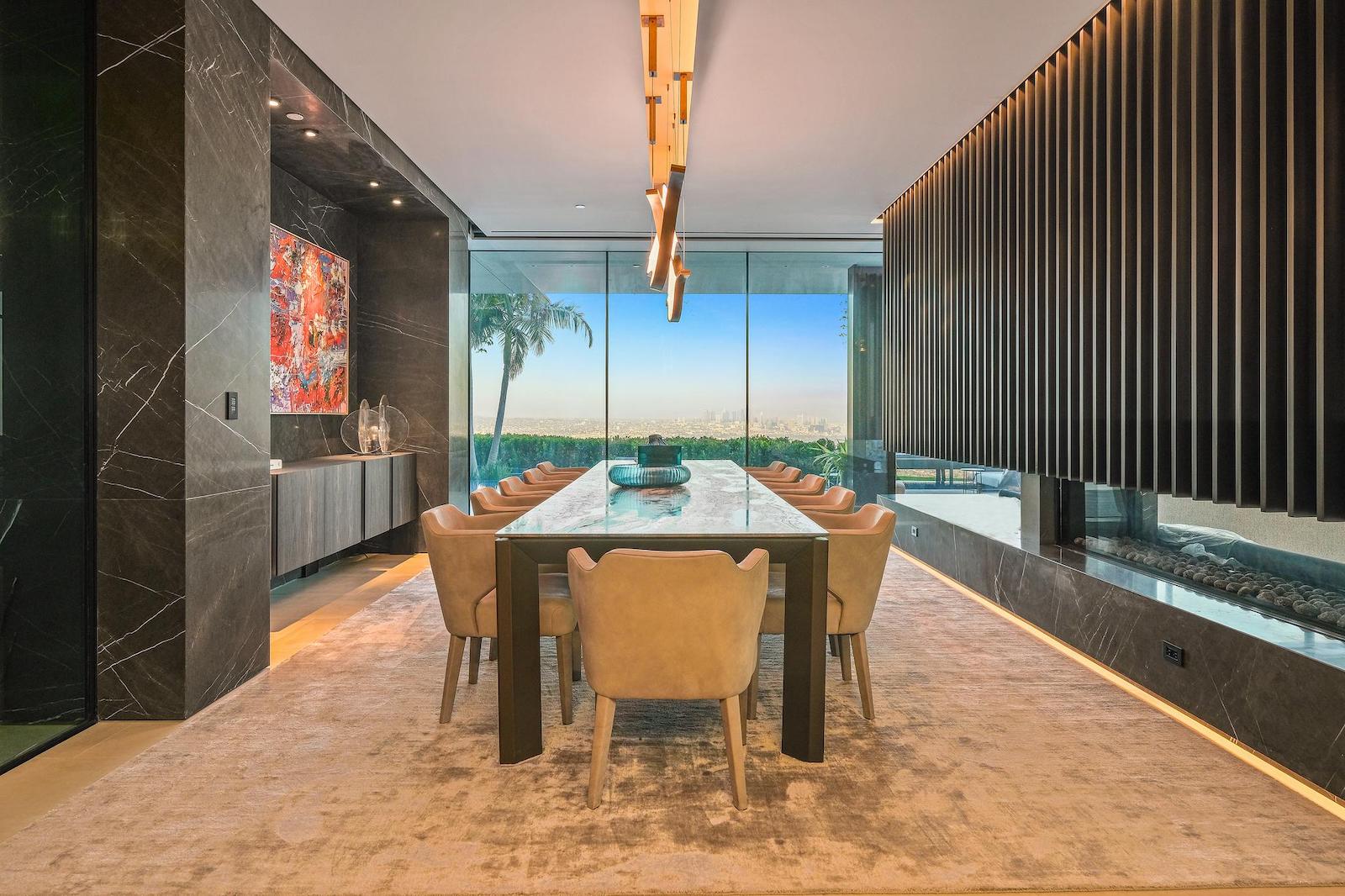 From world-renowned architectural design firm, Saota, this 20,000 sq. ft. estate is set on a promontory with unparalleled 300 degree city skyline views boasting unmatched design and exquisite bespoke finishes throughout. Automated glass sliding doors create a seamless confluence from the interior living spaces to plentiful outside seating and dining areas, including a 175-foot linear pool culminating in a waterfall cascading into an atrium garden. A 15-foot outdoor television rises from the ground with horizontal and vertical rotation, visible from every room in the house. Enormous entertainer's rooftop deck, state-of-the-art theater, curated wine cellar, glass elevator, unrivaled security and audio/visual integration, and a spa retreat replete with wet and dry sauna, cold and hot water plunge pools, and massage therapy. Private driveway leads to a multi-car garage. Unquestionably the most impressive property ever built above the Sunset Strip.